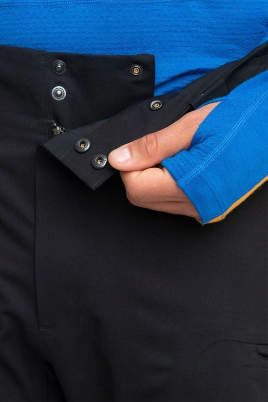 Designed for technical performance, the trousers boast articulated knee seams and a gusseted design, ensuring unrestricted mobility on challenging terrain. The adjustable waistband with snap buttons, velcro settings, and belt loops allows for a secure, customised fit. Whether you’re navigating steep trails or taking on alpine pursuits, the slightly flared hems accommodate boots with ease, while internal gaiters keep snow and debris out.