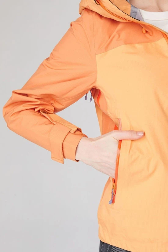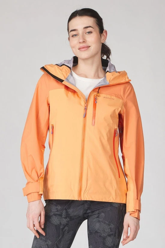 All zippers, including the YKK front zipper, are water-repellent. Additional features of the Mountain Peak 3-layer jacket include spacious side pockets, a chest pocket, underarm ventilation zippers, and an adjustable hood. Velcro strips on the sleeves effectively keep out cold wind and rain.