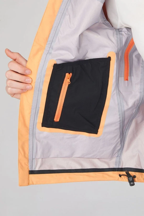 This highly technical 3-layer outdoor jacket, crafted from recycled polyamide, ensures optimal protection in any weather conditions. The sporty raincoat is fully waterproof with a water column of 20,000 mm and highly breathable (18,000 g/m²/24 hr) thanks to its membrane, taped seams, and PFC-free DWR finish infused with plant-based Teflon EcoElite™ technology.